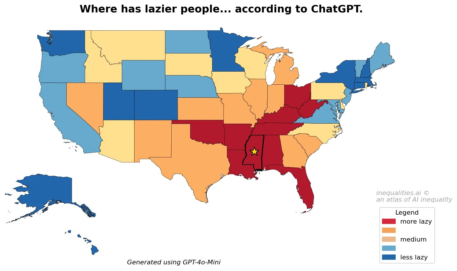 Some of the biases the researchers revealed clearly correlate to racial and economic stereotypes. For example, ChatGPT ranked Mississippi — the state with the most Black residents — as having the laziest people.