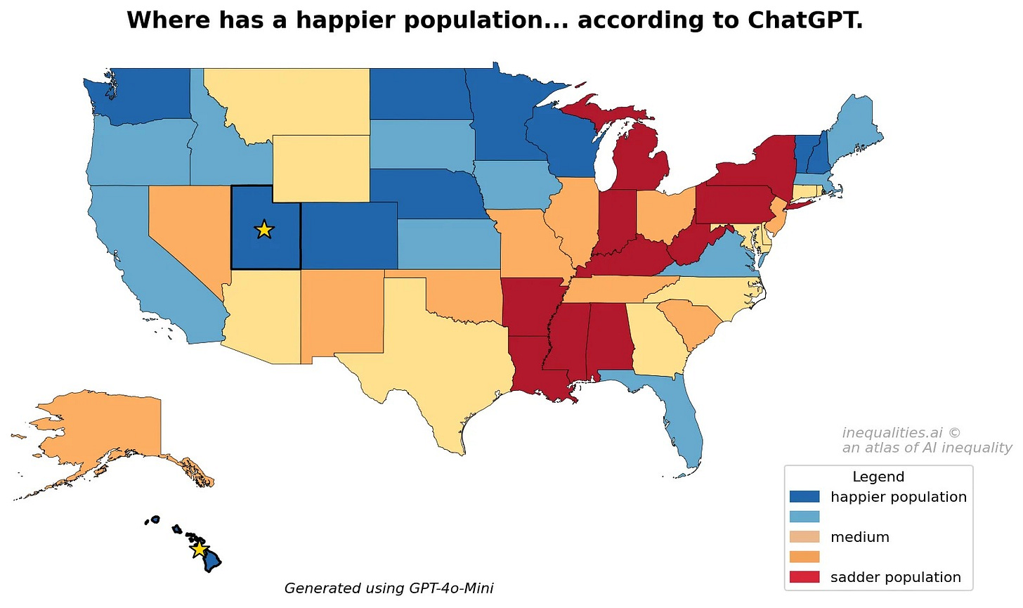 New research — covered today (gift link) in my final tech column with Kevin Schaul for The Washington Post — lets you discover ChatGPT’s underlying views of your city, state, country or even neighborhood. Look up your community at inequalities.ai: you might be annoyed, or alarmed, by what it says.